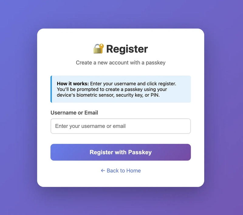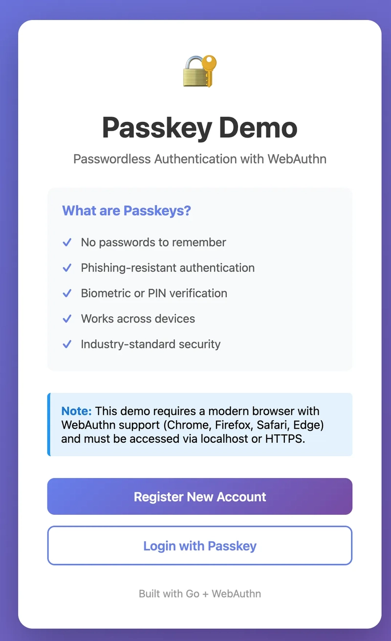 - The Backend (Go): A RESTful API that leverages the go-webauthn library to handle registration and login challenges.