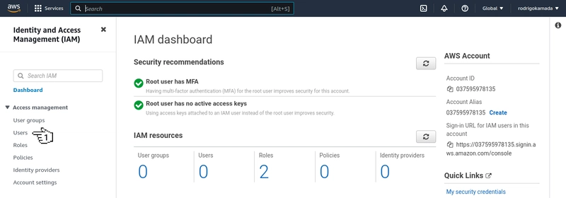 11. Now we will click on the tab Security credentials and click on the button Create access key.