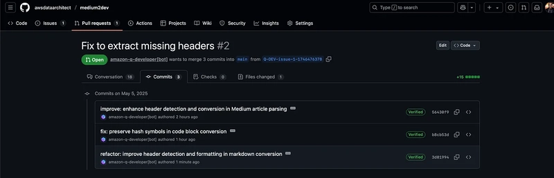 My previous blog post explains how I began my project using the Amazon Q Developer CLI to create a command-line tool that converts Medium blog posts to DEV.to-compatible markdown format. The initial development process was smooth, with Amazon Developer Q CLI helping me generate the core functionality: