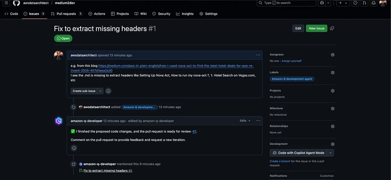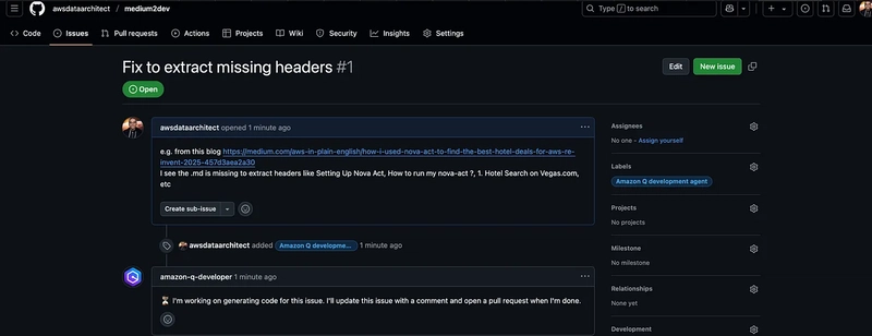 Amazon Q Developer in GitHub (in preview), was just launched yesterday and I immediately put it to work enhancing my Medium to DEV.to converter tool. This blog post shares my experience using the new GitHub integration to build and improve a project through AI-assisted development.