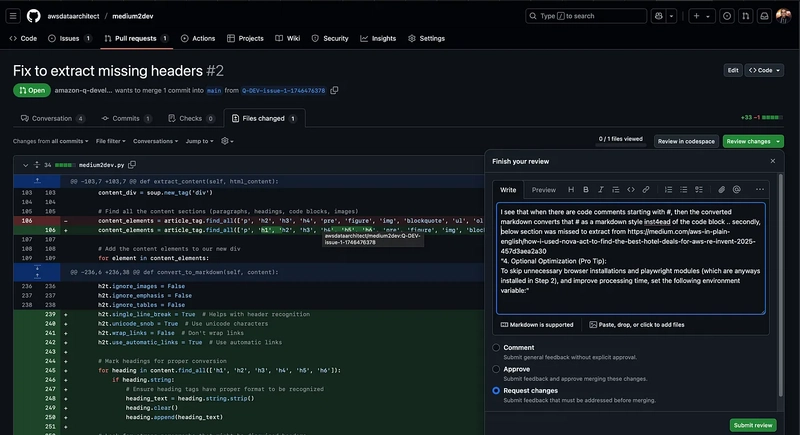 I noticed that the Amazon Q Developer Agent picks the changes from the code review comments, and not from the comments in Finish your review screen (which is sometimes confusing)