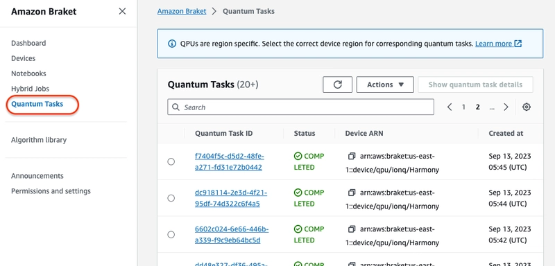 - After run a circuit on aws device, below page will display all Quantum Tasks, click anyone