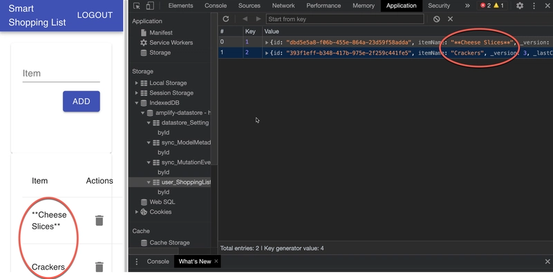 As mentioned before, when calling datastore API's we actually persist the data in IndexedDB in the browser, which makes it super easy to test. We can simply spin up the application, create some test data by executing the app's functionality. Then, if we want to make sure the data is persisting in the format expected, we can inspect it using the development tools of the browser and query indexedDB as shown below