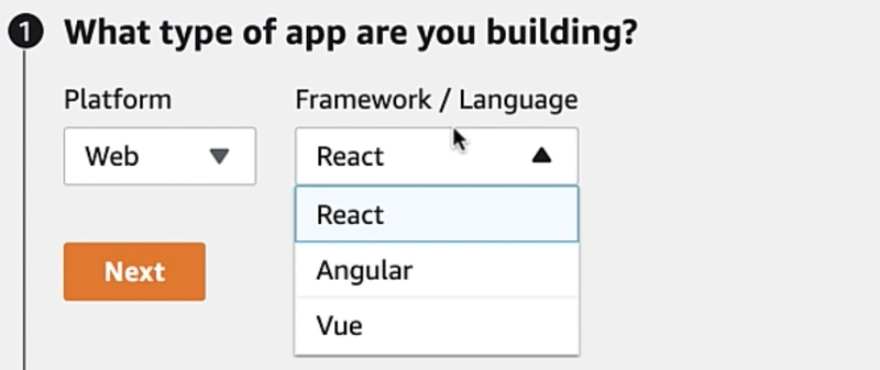 Choose the type of App we are building - we can choose either a Web, IOS or Android platform and then make the appropriate framework/language selection based on our platform selection. For this example, we are choosing a Web platform with React as the framework.