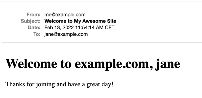 mail(to: @user[:email], subject: 'Welcome to My Awesome Site')
