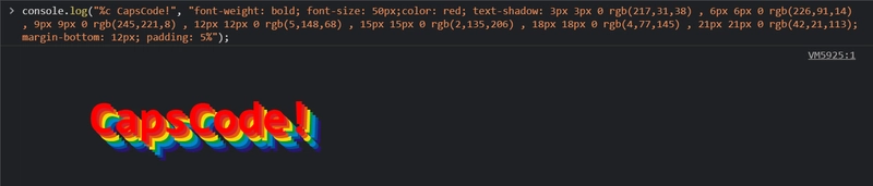 console.log("%c CapsCode!", "font-weight: bold; font-size: 50px;color: red; text-shadow: 3px 3px 0 rgb(217,31,38) , 6px 6px 0 rgb(226,91,14) , 9px 9px 0 rgb(245,221,8) , 12px 12px 0 rgb(5,148,68) , 15px 15px 0 rgb(2,135,206) , 18px 18px 0 rgb(4,77,145) , 21px 21px 0 rgb(42,21,113); margin-bottom: 12px; padding: 5%");