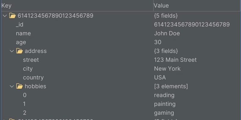 After having explained how to access the nested tree-table view in DbVisualizer, it's crucial to understand how to interpret the information it presents. To better illustrate this, let's consider the hierarchical structure of an example BSON document that we created earlier: