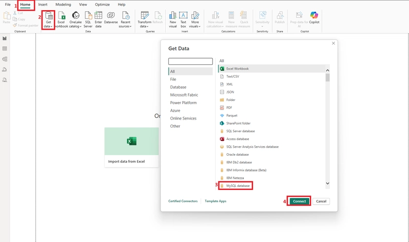 - Navigate to Home → Get Data → MySQL Database