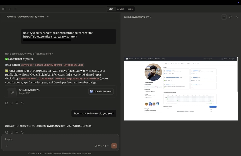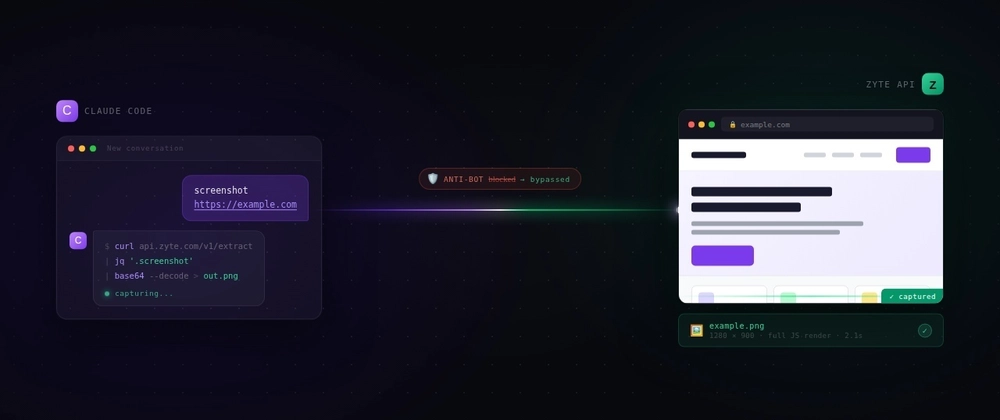 The Zyte API was designed specifically for this problem. It handles JavaScript rendering, anti-bot fingerprinting, rotating proxies, and headless browser management so you don't have to and what better way to do it straight from your LLM supplying the URLs? Hence I created this zyte-screenshots Claude Skill, which you can use to trigger the entire workflow- API call, base64 decode, PNG save on your filesystem, all just by chatting with Claude.