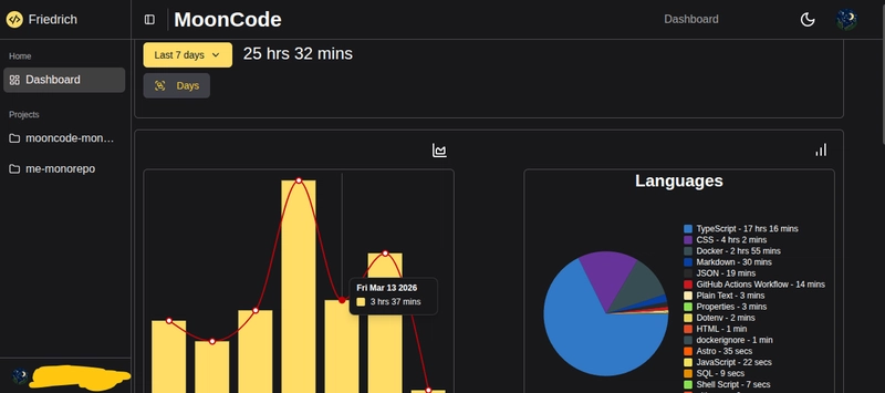 During the last months, I have being building an application called MoonCode to track my coding time, languages and projects I was working on. And let me visualize all that on a modern looking dashboard. In this article, I want to write about it, the features it currently has, how it works, why I built it and what I learned along the way.