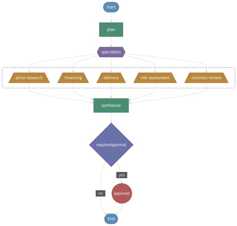 I hit this when building the purchasing coordinator. Five specialist agents dispatched in parallel, a conditional approval callback, plan and synthesis steps on either side. The code reads top to bottom, but the workflow branches and converges in ways that aren't obvious from the source. Two primitives in particular: context.invoke() calls another Lambda function with automatic checkpointing (unlike the AWS SDK's lambda.invoke(), the result is cached so the target function isn't called again on replay), and waitForCallback suspends the workflow until an external signal arrives. This is how the purchasing coordinator pauses for human approval.