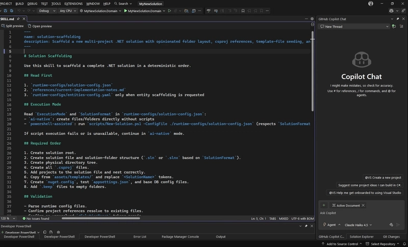 You can prompt Copilot to scaffold a new solution, and the agent will automatically execute the Skill.