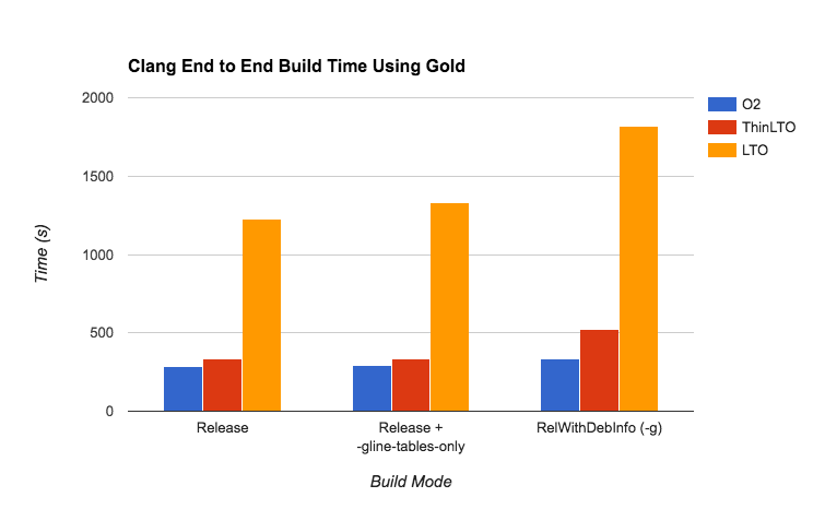 Release build shows how ThinLTO build time is very comparable to a non-LTO build. Adding -gline-tables-only adds a very small overhead, and ThinLTO is again similar to the regular non-LTO build. However with full debug information, ThinLTO is still somewhat slower than a non-LTO build due to the additional overhead during importing. Ongoing improvements to debug metadata representation and handling are expected to continue to reduce this overhead. In all cases, full LTO is actually significantly slower.