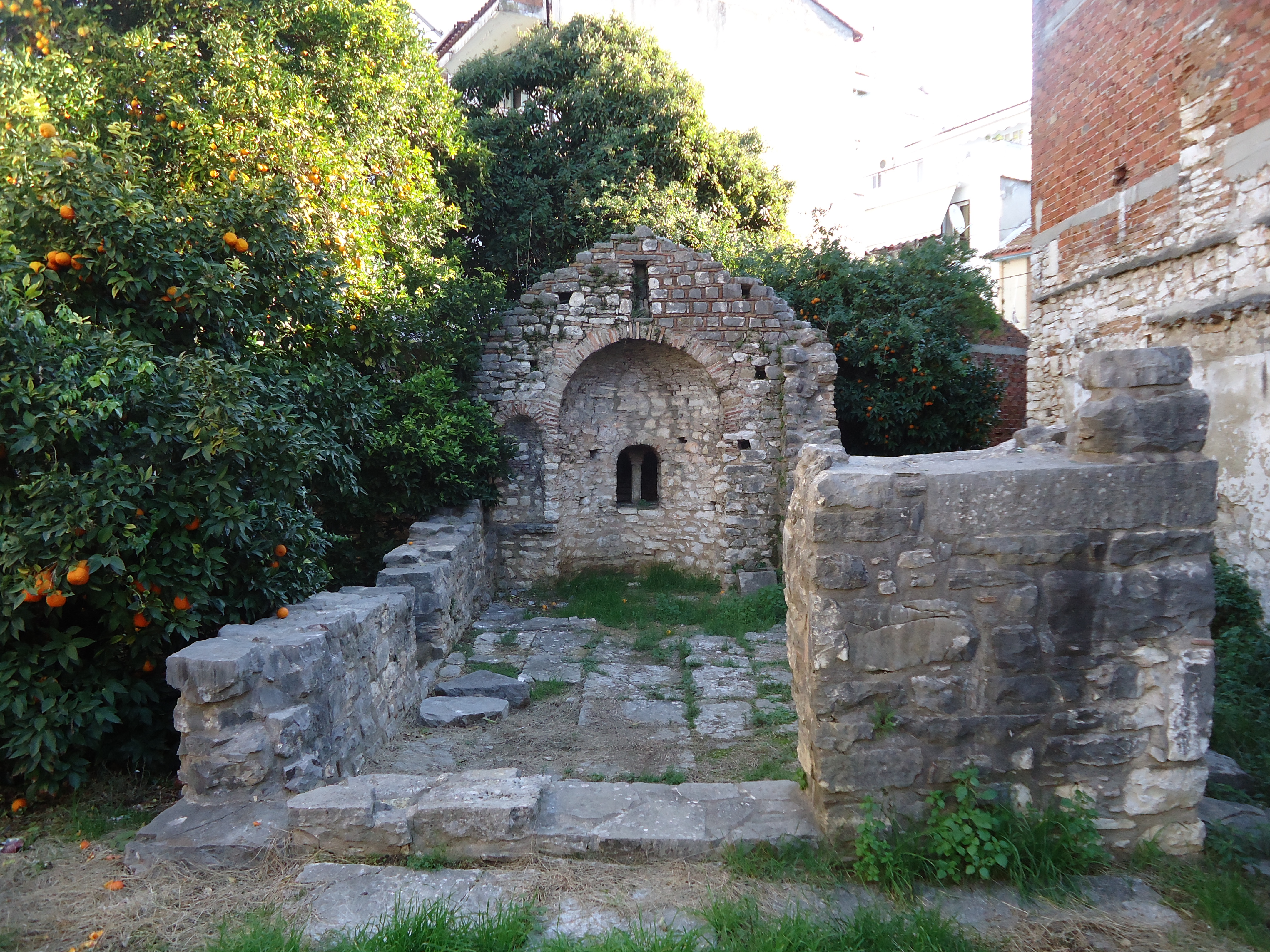 Ελληνικά: Κατεστραμμένος ναΐσκος του τέλους της Βυζαντινής περιόδου (14ος ή 15ος αιώνας) δίπλα στην περιοχή της λαϊκής αγοράς, κοντά στον Άγιο Βασίλειο.