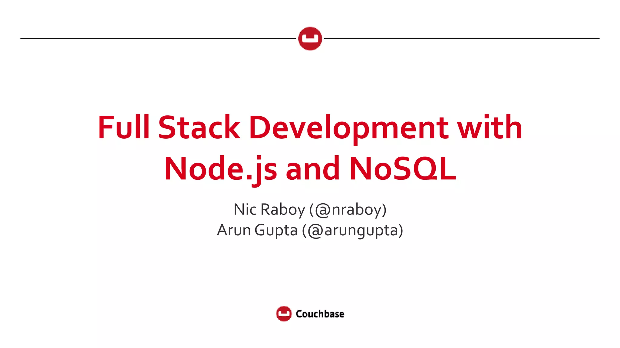 The document provides an overview of full stack development using Node.js and NoSQL, particularly focusing on Couchbase as a distributed operational database that supports agile development and scalable operations. It covers key features of Couchbase, including flexible data modeling, querying with SQL-like syntax (N1QL), and ease of integration with mobile and web applications. Additionally, it explores various endpoints for managing data and demonstrates application building techniques using Node.js and AngularJS.