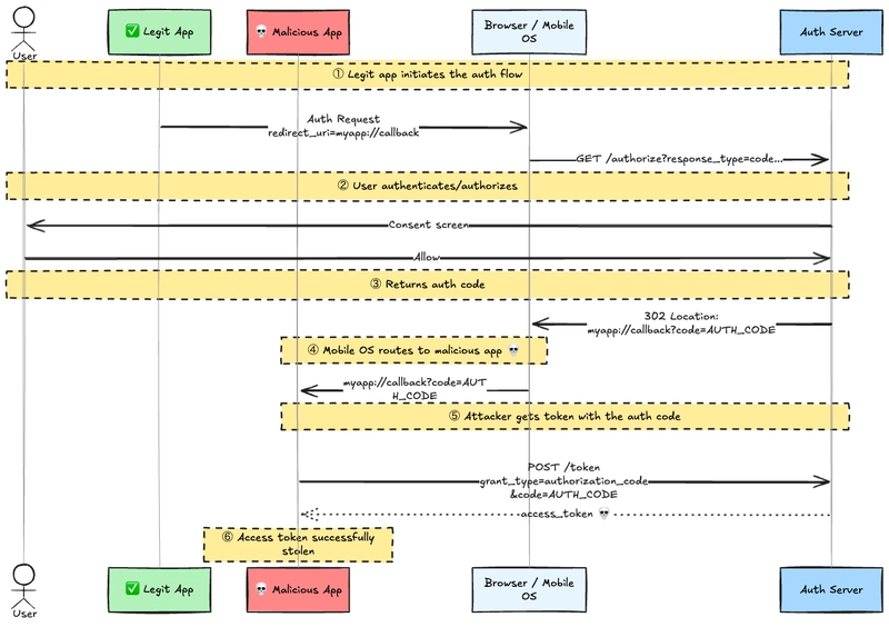 There’s a fatal, gaping vulnerability here. The moment the auth server tells the browser to redirect to myapp://, it completely surrenders control over which app on that phone actually catches the URL. The ball gets thrown out of your safe, locked-down server environment and straight into the lawless wasteland of the mobile OS.