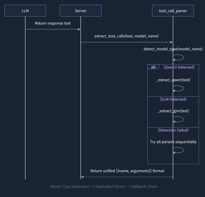The approach for tool_call_parser.py is a Fallback Chain. It detects the model family via its name, tries the dedicated parser first, and if that fails, it sequentially tries the rest of the parsers.