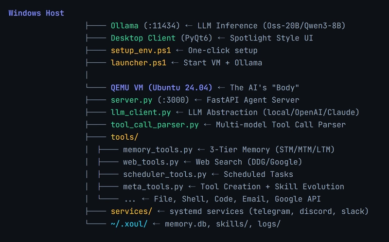 vm_manager.py (979 lines) manages the entire lifecycle of the VM. Initially, I built it for one simple reason—if the AI types rm -rf /, the host PC needs to be safe. But as I built it, I realized an even bigger advantage than isolation: The entire Linux ecosystem becomes the AI's playground and toolbox.