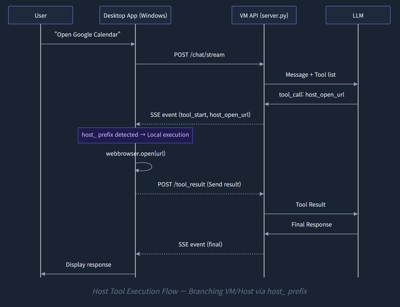 host_open_app("Chrome")fires from the VM, the desktop client scans.lnkfiles in the Windows Start Menu, finds the actual executable, and runs it.
