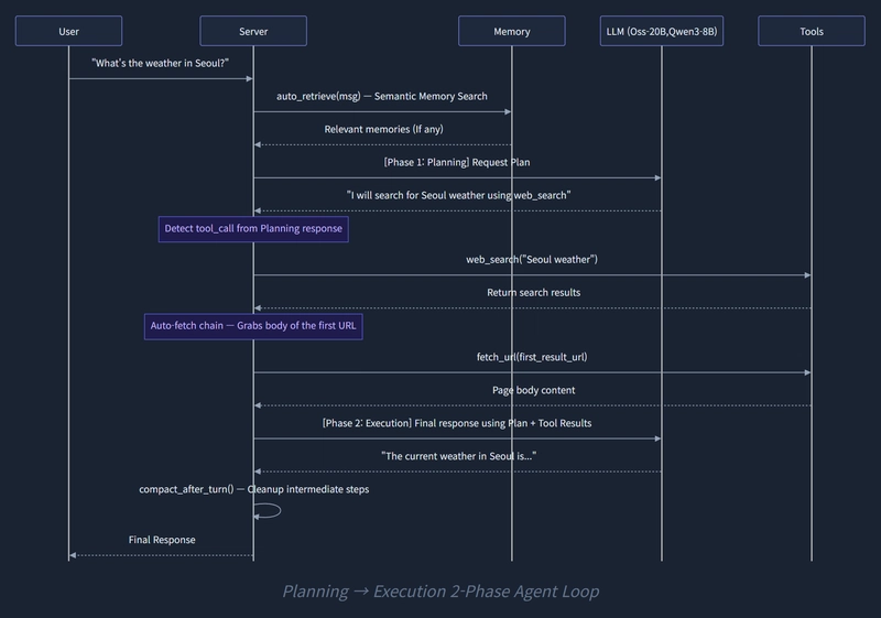 So, I split it into a 2-Phase Structure: Planning → Execution. I first ask the LLM, "Make a plan on what you're going to do," then execute the tools based on that plan, and finally synthesize the results to form an answer. This simple tweak alone doubled the perceived success rate of tool calling.
