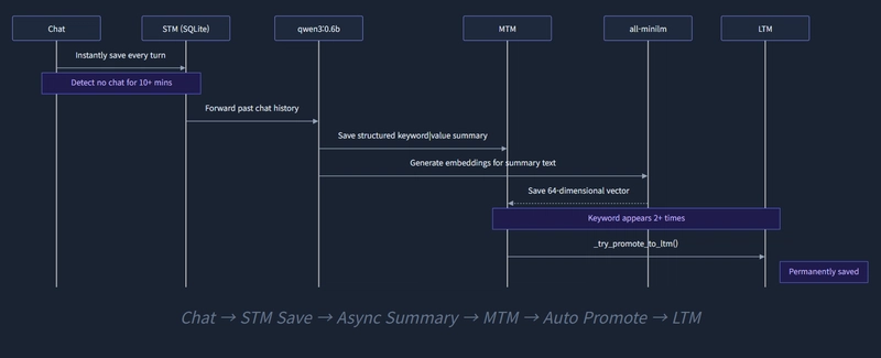 - STM (Short-Term Memory): Records every conversation turn instantly into SQLite. A safeguard so conversations aren't lost if the server crashes. Capped at 5000 chars.