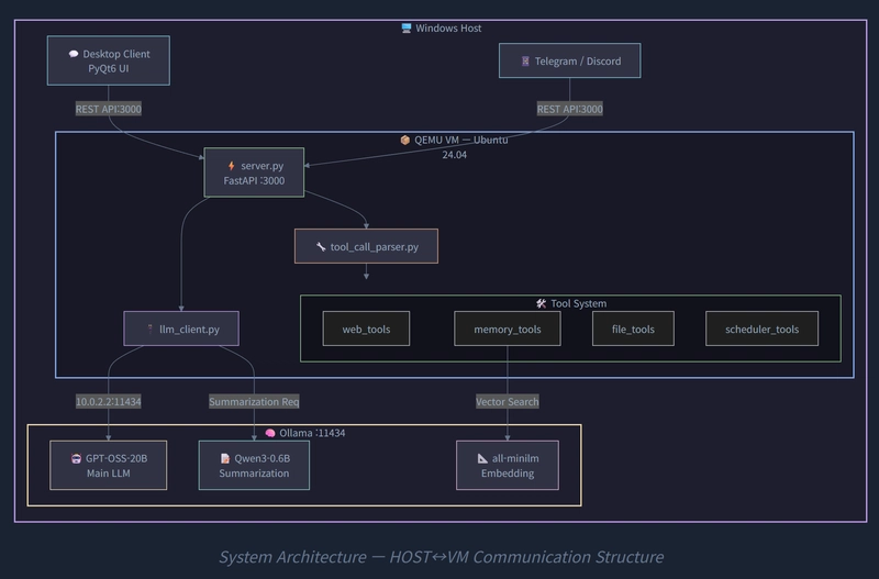 The big picture is simple. Ollama (LLM inference) runs on the Windows host, the agent server runs inside a QEMU VM (Ubuntu), and the two communicate via SSH + port forwarding.