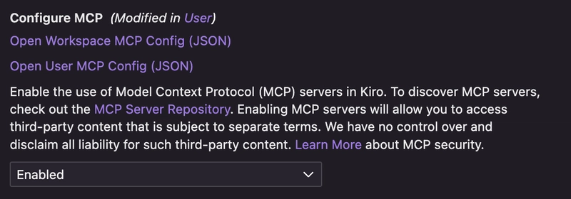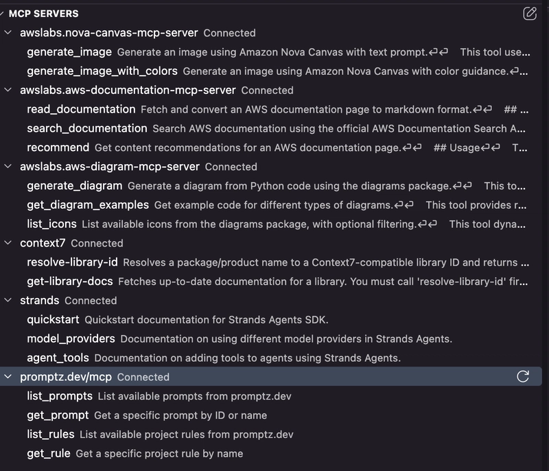 MCP extends Kiro's capabilities by connecting to specialized servers. You can easily manage MCP Servers in the Kiro panel. For my AWS heavy project, the AWS Documentation MCP server was invaluable: