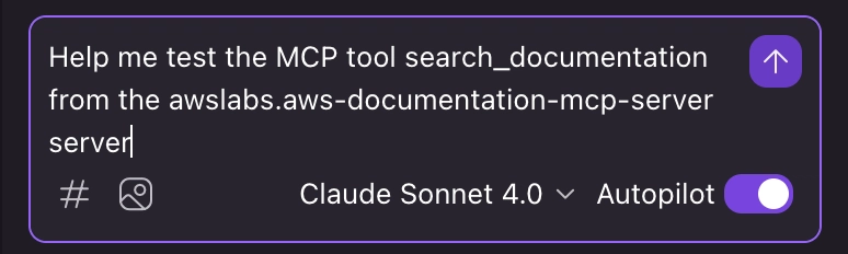 This gave me instant access to up-to-date AWS documentation, best practices, AWS Well-Architected Framework and implementation patterns directly within Kiro. Kiro will automatically use the appropriate MCP tools to answer your questions or you can provide explicit context like: #[aws-docs] search_documentation Tell me about Transforming data with JSONata in Step Functions. The MCP servers tab displays configured servers, their connection status, and available tools. Click any tool to test it with a placeholder prompt in chat: