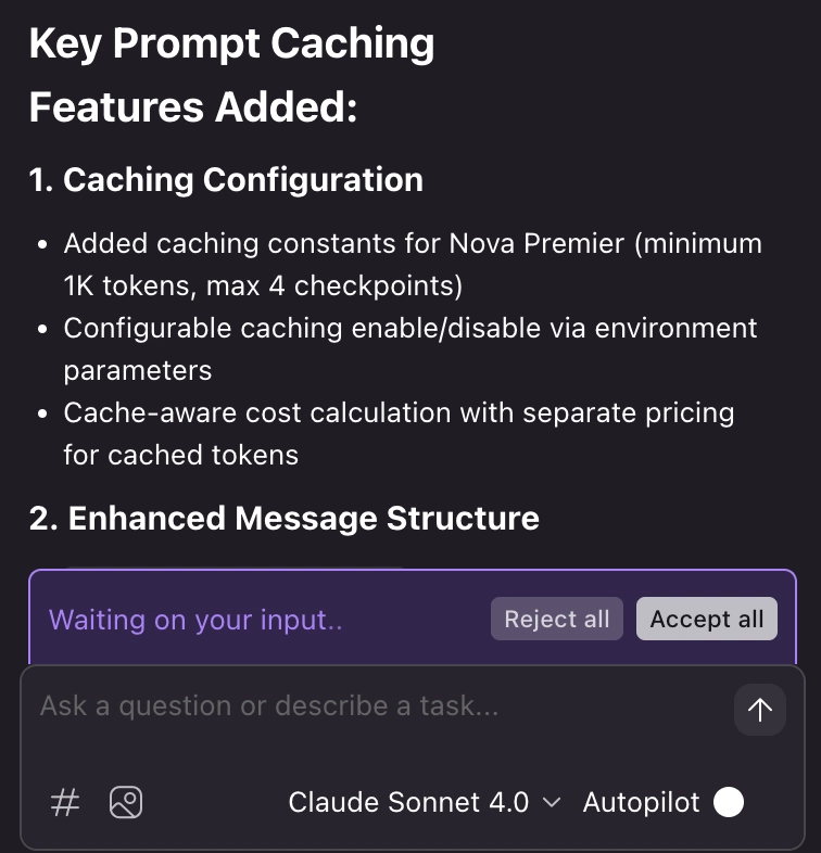 For my AI Compliance Auditor project, Autopilot mode was perfect for implementing the foundational components: data models, Lambda functions, and infrastructure code.