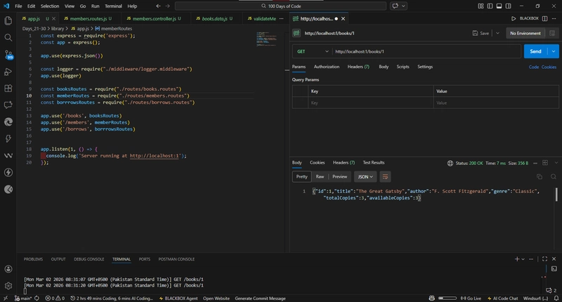 Today marks Day 28 of my #100DaysOfCode journey, and this session felt extra special. After learning the fundamentals, including Node.js, Express.js, REST APIs, middleware patterns, routing strategies, and working with request data, I combined these concepts to build a backend for a simple Library Management System.