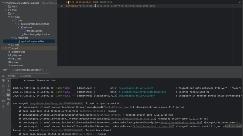 A frequent issue arises when the MongoDB URI in your application’s configuration points to an outdated server. In a Spring Boot application, the application.properties file typically defines the URI. If the URI refers to a server that is no longer running—perhaps decommissioned during a system migration—the application cannot connect. After the default timeout period (e.g., five seconds), the MongoDB Java driver throws a MongoTimeoutException: “Timed out after 5000 ms while waiting to connect.” This error disrupts all database operations, causing user-facing errors and application failures until the URI is updated to point to the correct server (e.g., mongodb://user:pass@prod-server:27017/test).