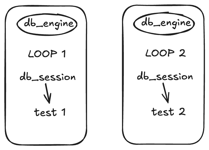 So you will think, “I will keep DB engine in session scope, and let tests run in function loops” atleast that is what i thought. Something like this,