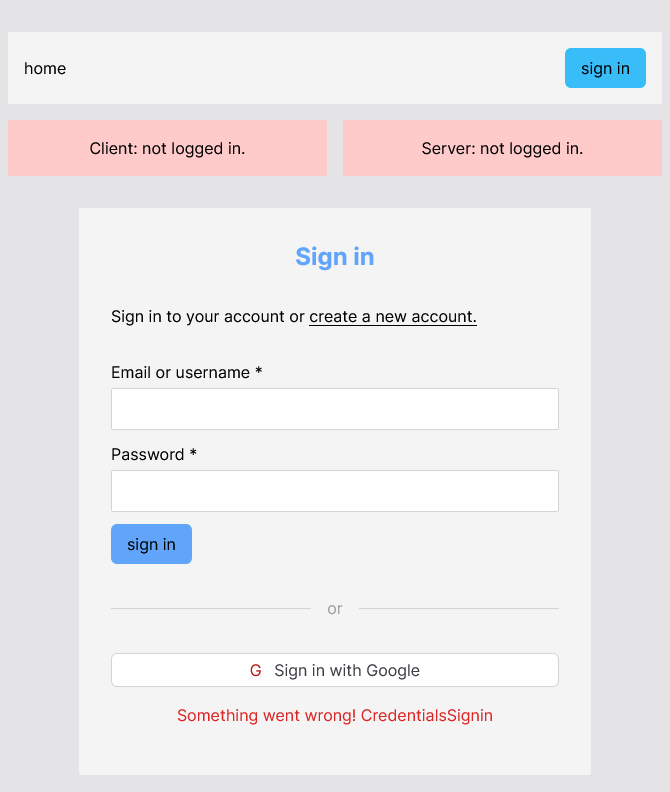 The value of this error searchParam is one the the NextAuth error codes: CredentialsSignin. On top of this, the error handling we initially setup for GoogleProvider works here too and will display the error below the form.