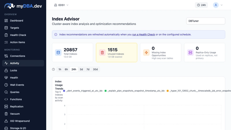 myDBA.dev provides automated health checks, query performance analysis, and index recommendations to keep your PostgreSQL databases running smoothly. It surfaces problems before they affect users and recommends specific fixes -- from autovacuum tuning to missing index suggestions.