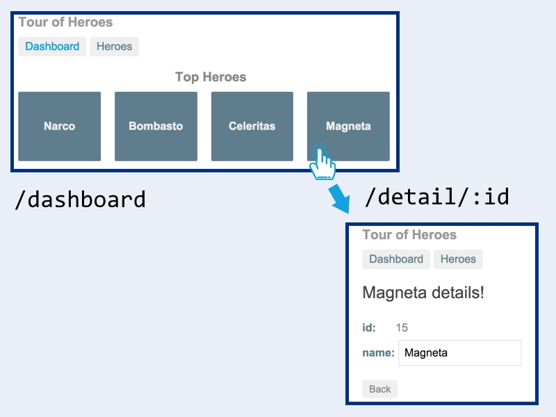 As a case study, we write routing component tests for the DashboardComponent from the Tour of Heroes tutorial on Angular.io. This routing is part of the show hero detail use case as shown in Figure 1: