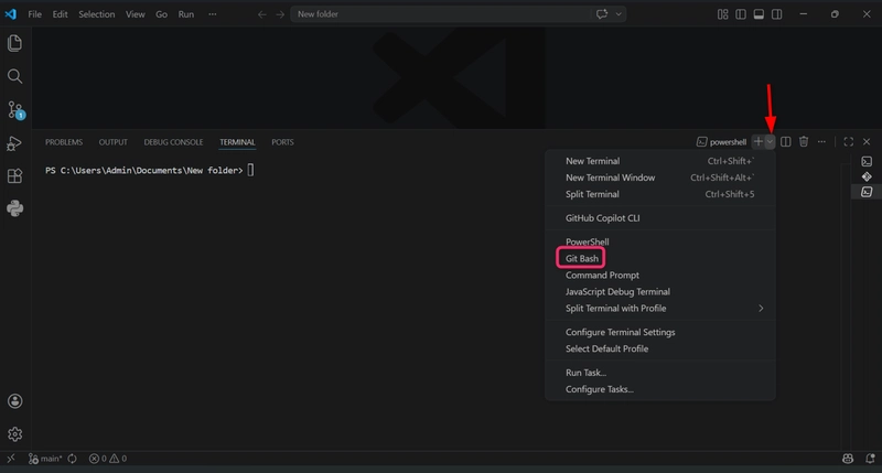 Select Git Bash: In the top-right corner of the terminal pane, click the dropdown arrow (usually says "powershell" or "cmd") and select Git Bash.