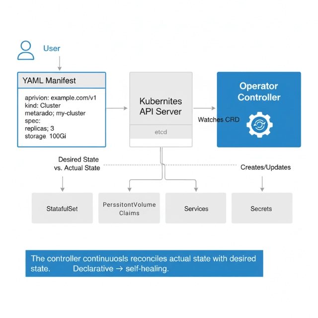 - Operators encode DBA expertise into software : They extend Kubernetes with custom resources (clusters, backups, users) and automatically handle provisioning, scaling, failover, and recovery—no manual scripts.