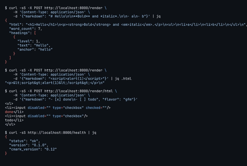 Entry #133 in this 100-project sweep was the PHP version of a tiny HTTP wrapper around that surface area β markdown-api, built on Slim 4 + league/commonmark. It is a nice piece of PHP. league/commonmark is serious CommonMark 0.31, thoroughly maintained, and exposing it as an HTTP service takes about 200 lines of glue. But "PHP over FPM that parses a few KB of Markdown per request" has a floor latency that is perfectly fine for most documentation sites and completely wrong for a service that gets hit in the critical path of every page load on a big app.