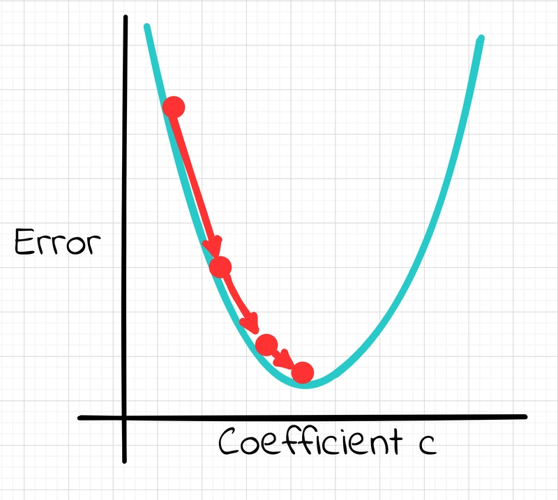 The red dots on the graph show the value for C for each iteration of gradient descent. The arrows indicate in which direction the algorithm would alter C in order to find a smaller error.