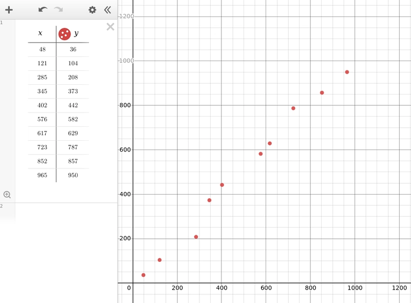 To graph a few things, I'll use Desmos, which is an amazing tool to fiddle around with maths. On a graph, the data looks like this: