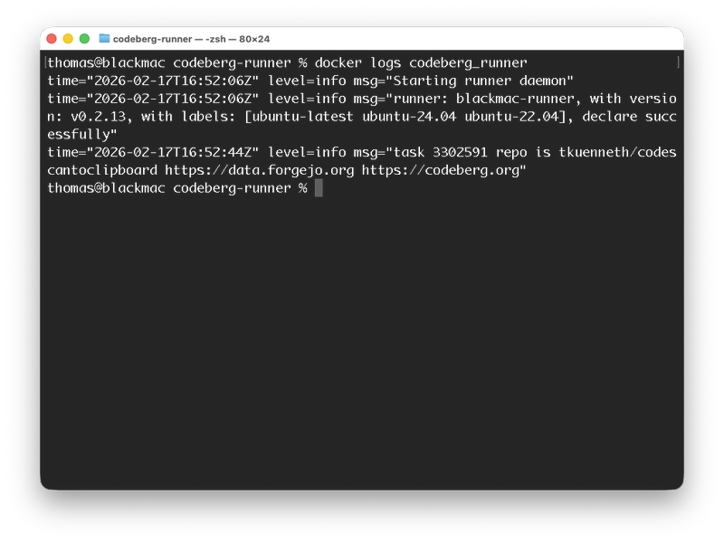 And we are live! The daemon is now connected to Codeberg and listening for jobs. To use it, simply reference the label we just registered (blackmac-runner) in your workflow file, exactly as shown earlier. The key difference here is that your jobs will now execute directly on your Mac's host system, bypassing the container layer and giving you full access to local tools like Xcode or the Android SDK.