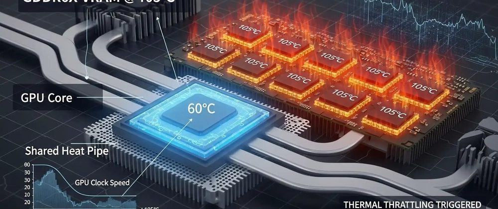 Modern GDDR6X memory chips run incredibly hot. In a laptop with shared heat pipes, the GPU core can be perfectly cooled while the VRAM hits 105°C, triggering a massive hardware-level thermal throttle.