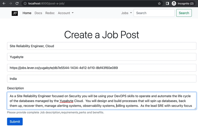 uvicorn main:app --reloadto run the application and visit http://127.0.0.1:8000Perform the operation of registering the user, creating and deleting job posts, etc. You will see the values reflected in the database - you can also see the tables created by the application under your cluster page.